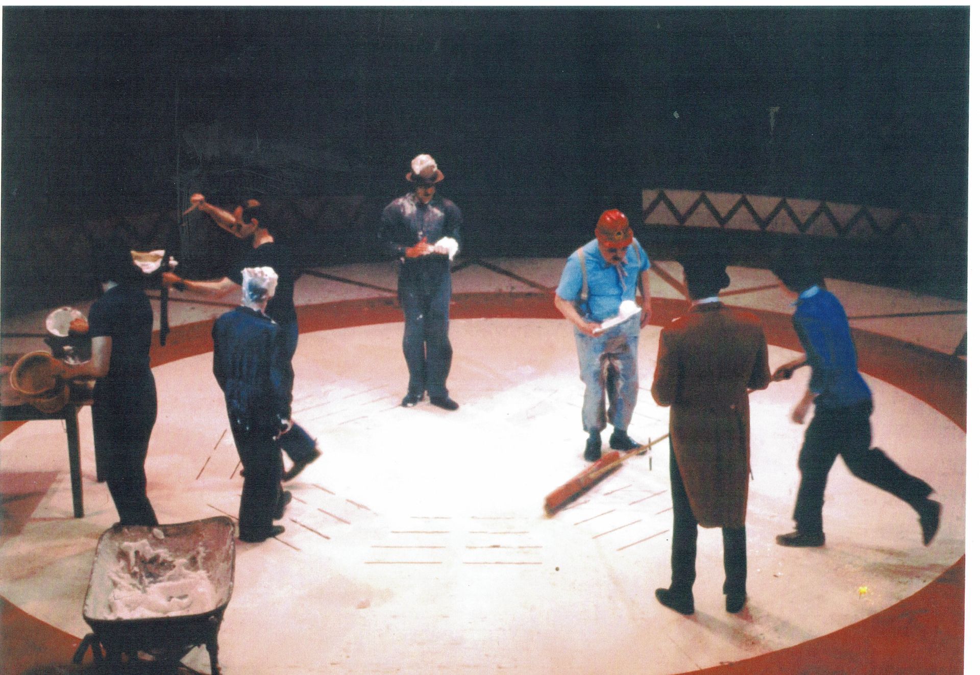 Under the direction of ringmaster Norman Barrett, the ring boys bring a table into the ring with a chair placed on top of it, as though preparing for an acrobatic routine. Unfortunately, a painter has left a bucket of yellow paint on the chair—something the ring boys appear not to have noticed.