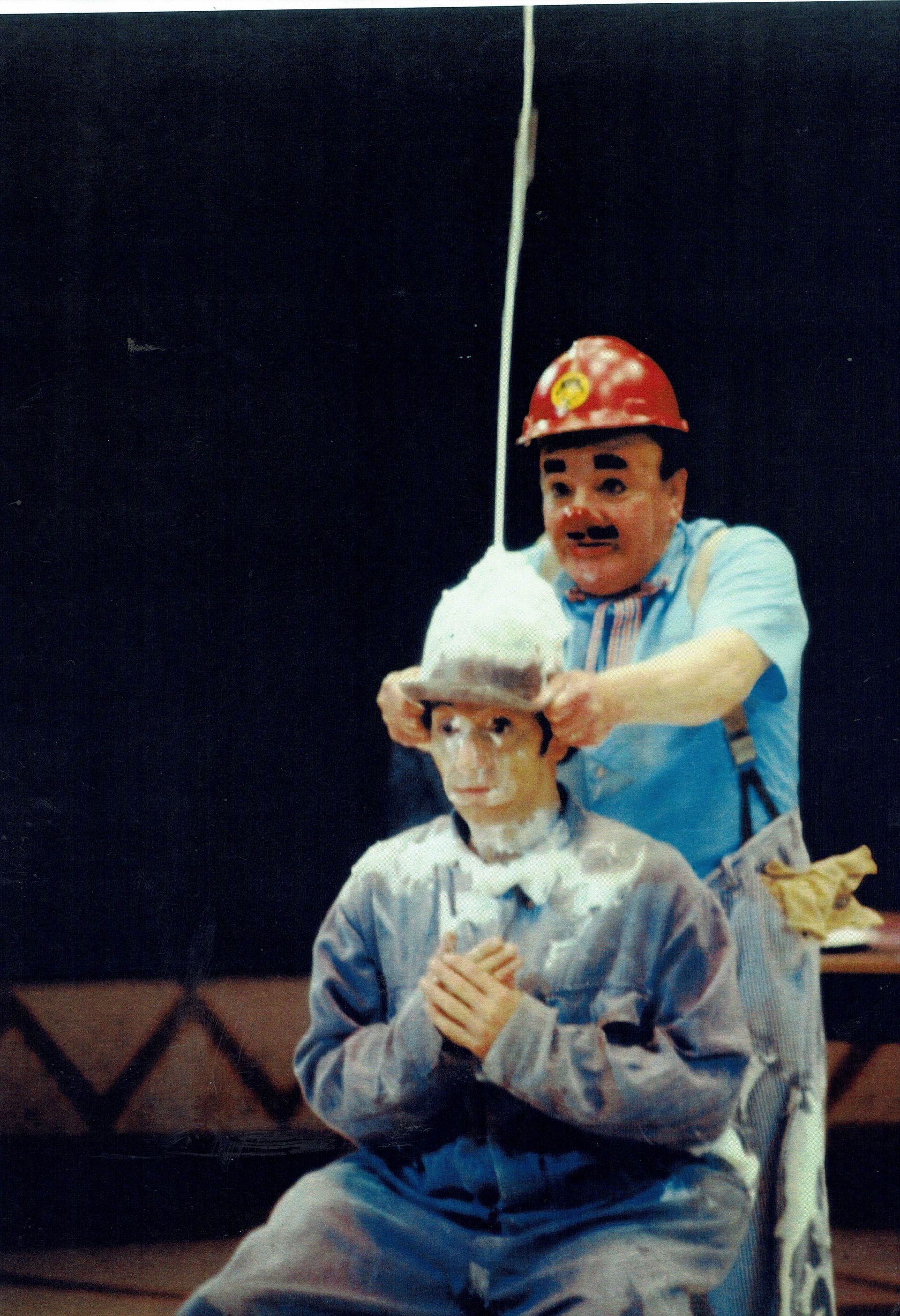 Charlie enters in his customary baggy trousers held up by braces, wearing a crushed helmet like those used on building sites. Junior and Little Jimmy, both in blue boiler suits, accompany him. They appear as three Tower Circus maintenance workers taking their tea break.