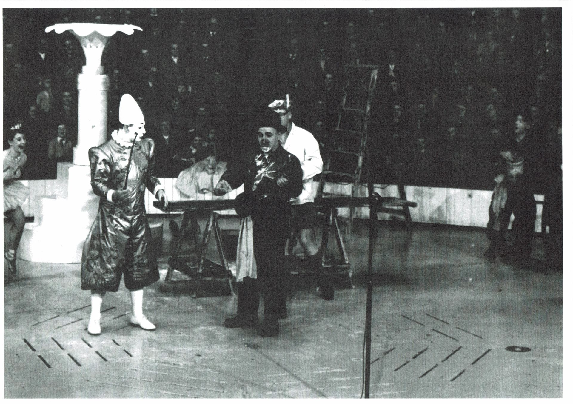 Enter Paul, dressed in a special rubber whiteface clown costume (easy to clean after every show), carrying his violin. Charlie wanted him out; Paul refused. Charlie “missed” the violin with his paint, and Paul retaliated by messing Charlie’s boiler suit.