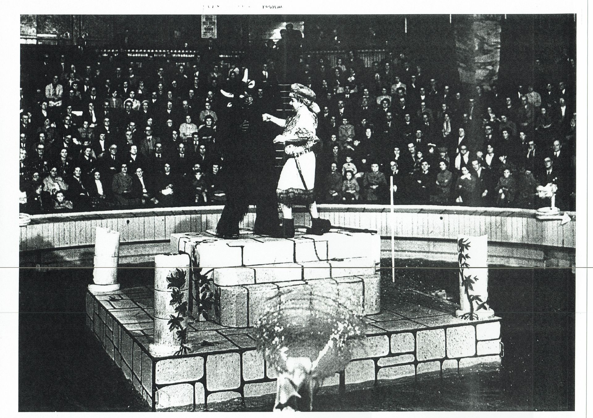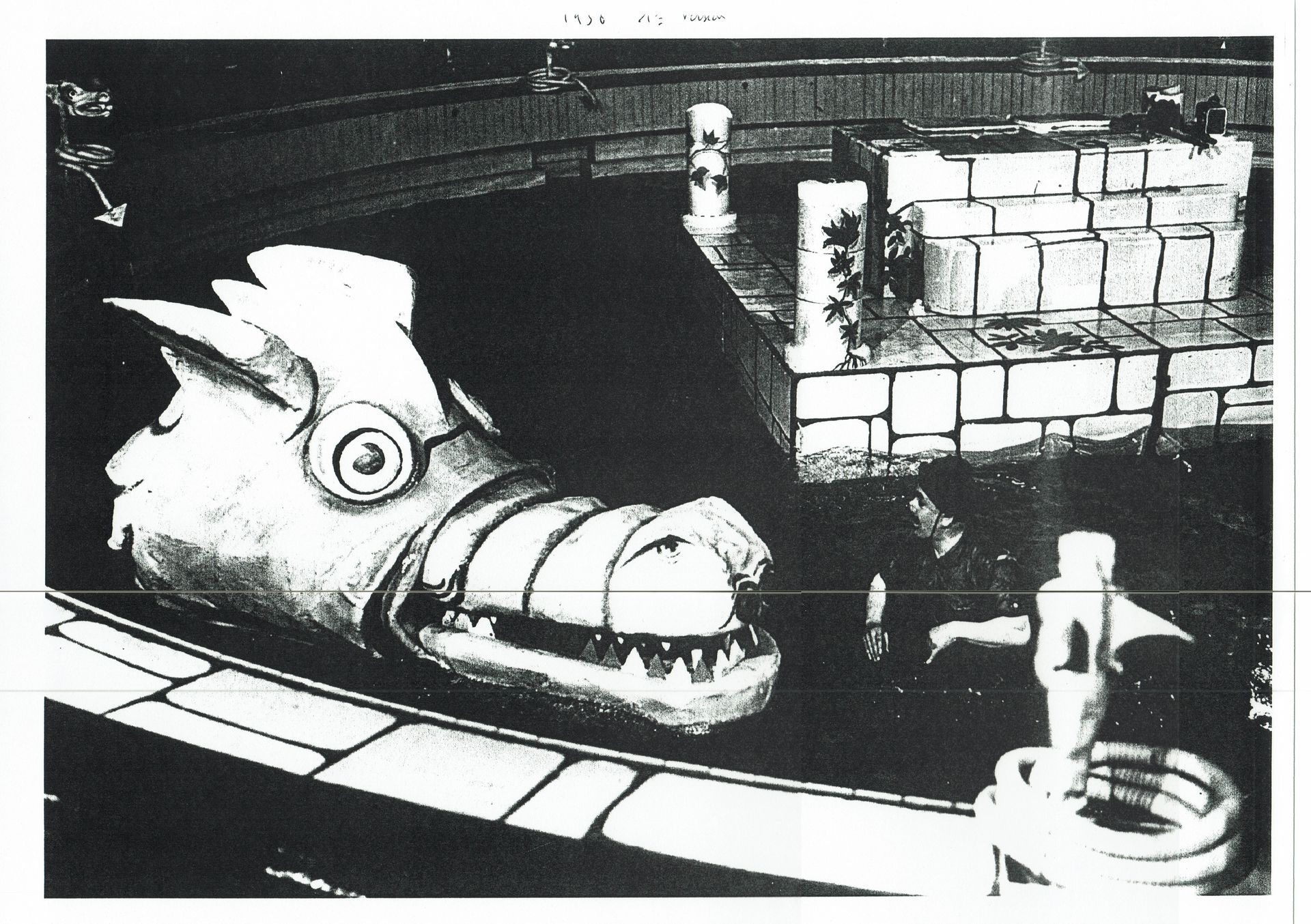 The Tower Works Department faced a significant challenge: they had to create both the Minotaur costume and a water monster that would pursue Charlie throughout the routine. They built a huge alligator-like head operated by two swimmers, but the creature proved extremely difficult to manoeuvre. In the water it could hardly move at all.